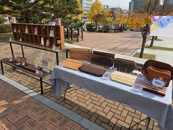 한울타리 가족분들도 제작에 직접 참여한 도마와 장식장 등 목공작품을 전시하고